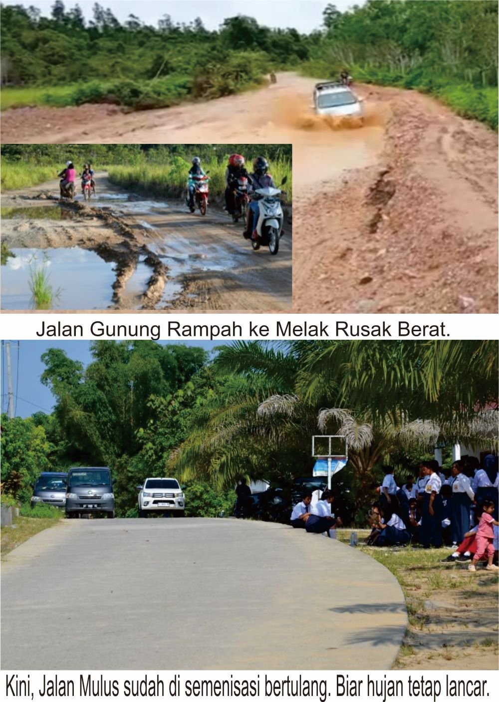 Permasalahan ini terjadi itu dulu atau 10 tahun silam. Setelah Bupati Kutai Barat yang dijabat oleh FX Yapan bersama Wabup Edyanto Arkan, telah merubah itu semua. Jalan rusak itu tinggal kenangan pahit. Kini akses jalan sudah mulus karena di-rigiq beton betulang. Biarpun hujan tetap mudah dilintasi warga. Konsep pembangunan dari kampung oleh Bupati FX Yapan sudah sangat tepat. Ini benar-benar peduli dengan nasib warga di perkampungan. Yang sama-sama ingin menikmati pembangunan. Untuk pembangunan ibu kota kabupaten jangan dipaksakan. Tapi kampung-kampung yang harus diutamakan.