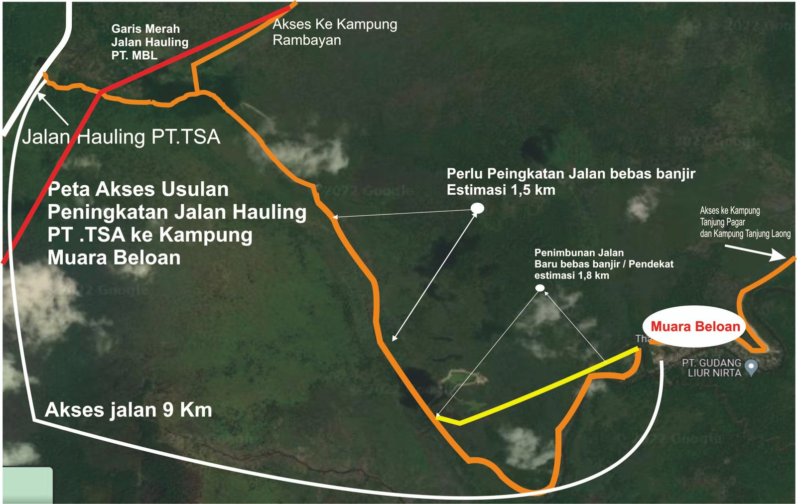 Upaya perbaikan jalan tanah oleh PT. TSA sudah dilakukan. Namun karena banjir dan sering hujan ya rusak lagi. Kini PT TSA sudah tutup. Berharap PT. Manaar Bulatn Lestari (MBL) belum ada respon. Padahal sudah disampaikan berkali-kali agar membantu memperbaiki. Kita berharap anggota DPRD dapat turun tangan membantu menjembatani masalah ini. Kita tunggu aja ya. Semoha didengar mereka.