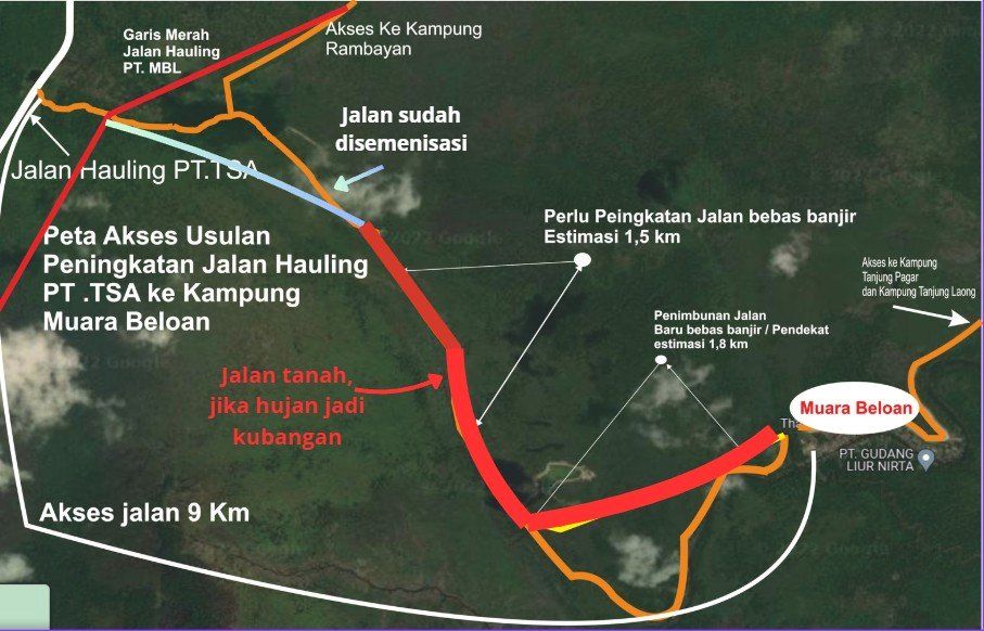Sementara itu, Petinggi Muara Beloan Rudy Suhartono, menyadari betapa pentingnya akses jalan di Muara Beloan. Karena banyak menjadi keluhan selama ini. Terutama ketika hujan, jalan tanah liat itu menjadi bubur. Banyak kendaraan warga terpaksa ditinggal di bibir jalan di hutan. Padahal jauh dari pemukiman penduduk Muara Beloan. “Mau tidak mau ditinggal. Karena mau di bawa pulang tidak bisa karena tanah liat yang membungkus ban kendaraan. Ditimbal setelah beberapa hari  baru diambil lagi,” kata Rudy.