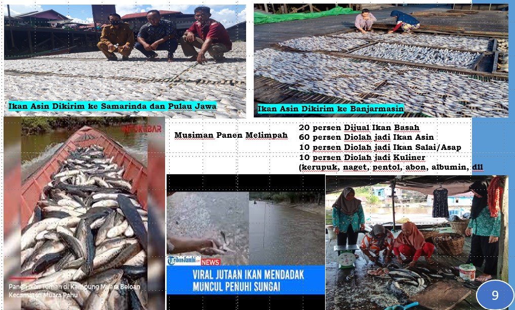 Untuk pengolahan ikan asin dan asap/salai. Jenis ikan asin yakni biawan, haruan, toman dan lepok sekitar 100-500 kg per hari. Untuk estimasi sebulan atau 30 hari sekitar 3.000 kg/3 ton sampai 15.000 kg/15 ton. Untuk harga jual per kg antara Rp25 ribu sampai Rp55 ribu. Omset, per bulan ikan asin untuk harga Rp25 ribu per kg menghasilkan antara Rp75 juta sampai Rp165 juta. Sedangkan harga Rp55 ribu per kg mendulang pendapatan Rp375 juta sampai  Rp825 juta.
