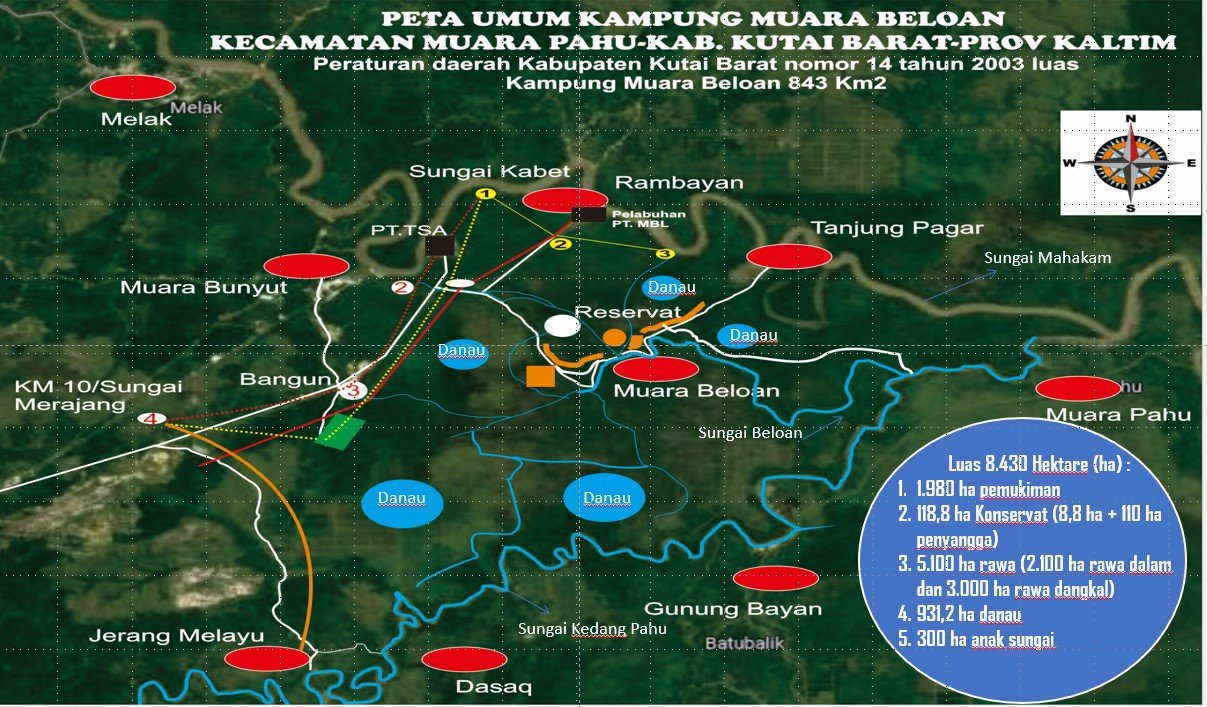 SESUAI Peraturan Daerah (Perda) Kabupaten Kutai Barat Nomor 14 Tahun 2003 tentang pembentukan Kampung Muara Beloan dan puluhan kampung lainnya. Bahwa, luas wilayah Muara Beloan 8.430 hektar. Dari luas lahan itu, sekitar 95 persen kawasan rawa, sisanya puluhan anak sungai, dan danau. Kemudian, sekitar 5 persen pemukiman dan hutan satwa.